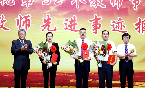 Education is a long-term endeavor and teachers play a very important role in it. At 3 p.m. on September 9 in the auditorium on the fifth floor of New Teaching Building, our school held a grand meeting to celebrate the 32nd Teachers’ Day with the day approaching. Meanwhile, remarkable teacher representatives were invited to deliver a report. The meeting aimed to award those groups and individuals who were outstanding in teaching, scientific research, management, services and so forth so that their excellence could be recognized and followed. All school leaders, together with mid-level management staff, directors of departments, all college counselors, advanced individuals and representatives of groups, some teachers and student representatives were present at the meeting. Lu Yan, Deputy Party Secretary, presided over the meeting.