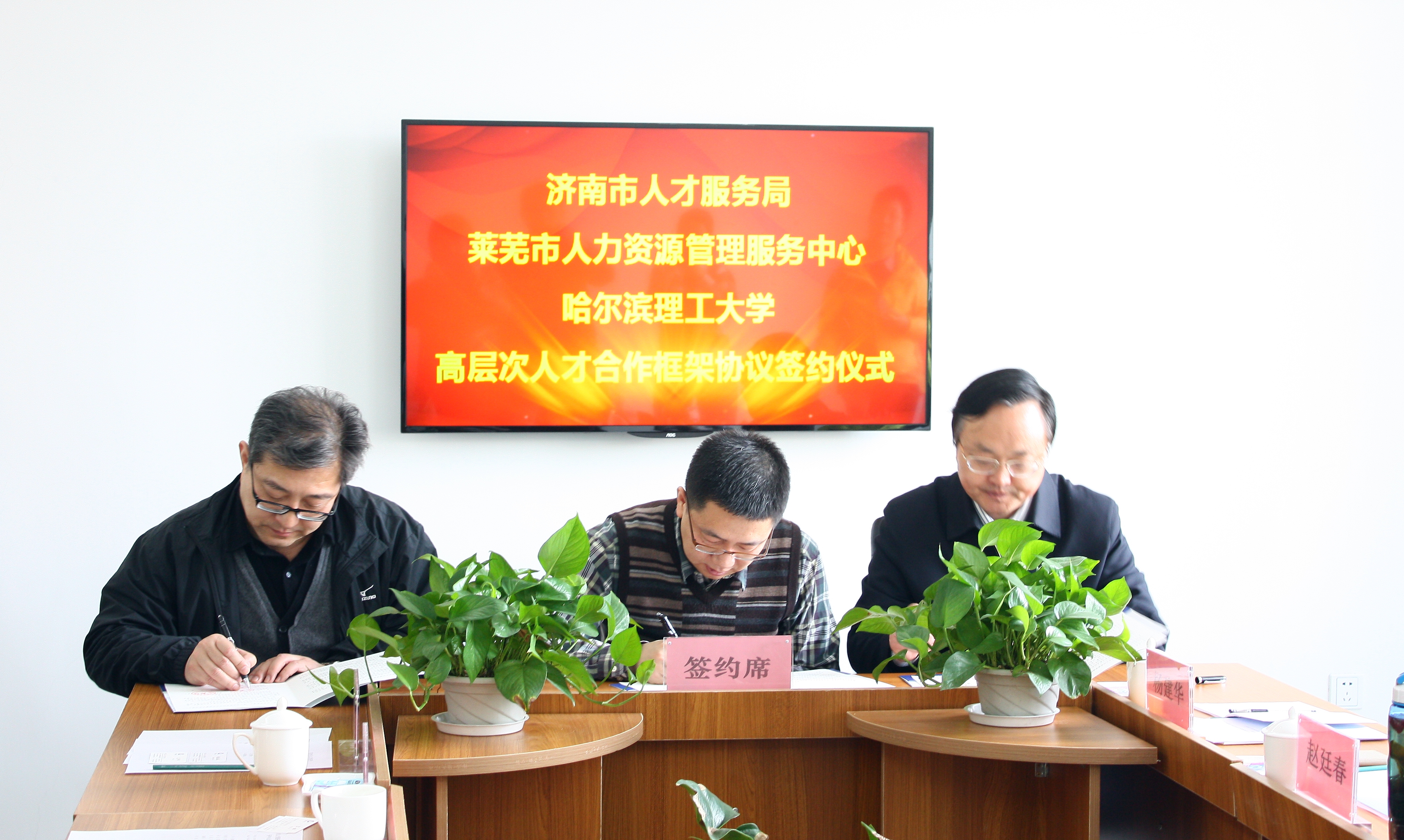 Before the signing ceremony, the deputy director of Enrollment and Employment Office Wang Qi, extended the warm welcome to the arrival of deputy director of Jian Talent Service Bureau. At the same time, he introduced in details the history and development of Harbin University of Science and Technology, the discipline construction and students cultivation. He focused on the students from Shan Dong both in Harbin and Rongcheng. Lan Hua expressed the appreciation for the arrangement of our university. Then he introduced the purpose and plan of signing high level talent cooperation framework agreement. Wang Qi, Lan Hua and Gao Hui signed the tripartite partnership agreement.
