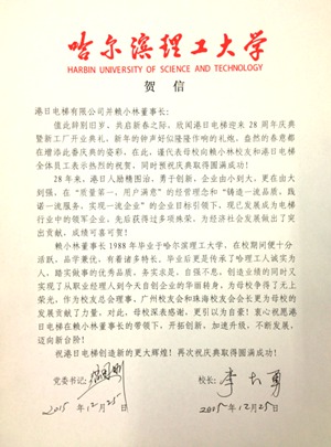 On December 28th, 2015, Gangri Elevator Co., Ltd. (Lai Xiaolin, chairman of the company, alumnus of Grade 1984, President of Guangzhou Alumni Association and Zhuhai Alumni Association) grandly observed the 28thanniversary celebration and the opening ceremony of Zhuhai manufacturing base and other series of activities in Zhuhai. Zhao Guogang, Secretary of HUST CPC Committee, and Li Dayong, President of HUST sent a congratulatory letter.