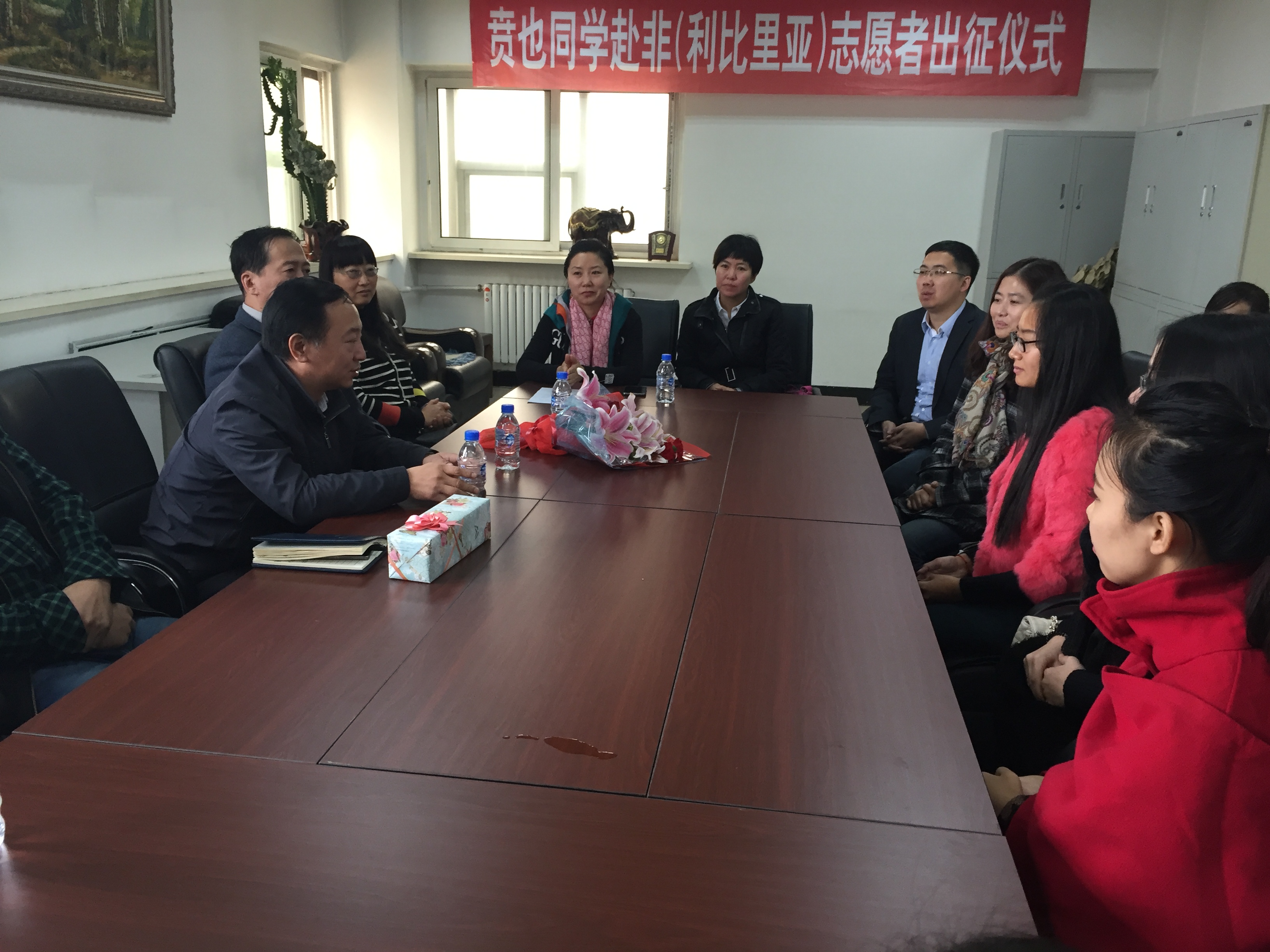 On Oct. 10, theSchoolofForeign Languagesheld a ceremony for Ben Ye who was going to interpret for the 9thmedical team to aidLiberia. Vice Dean of Graduate School Duan Hongwei, Counselor Office teacher Yan Tingliang, all the leaders of Foreign Languages School, student representatives attended the ceremony, hosted by Vice General Secretary of Foreign Languages School Zhou Xiaoli.