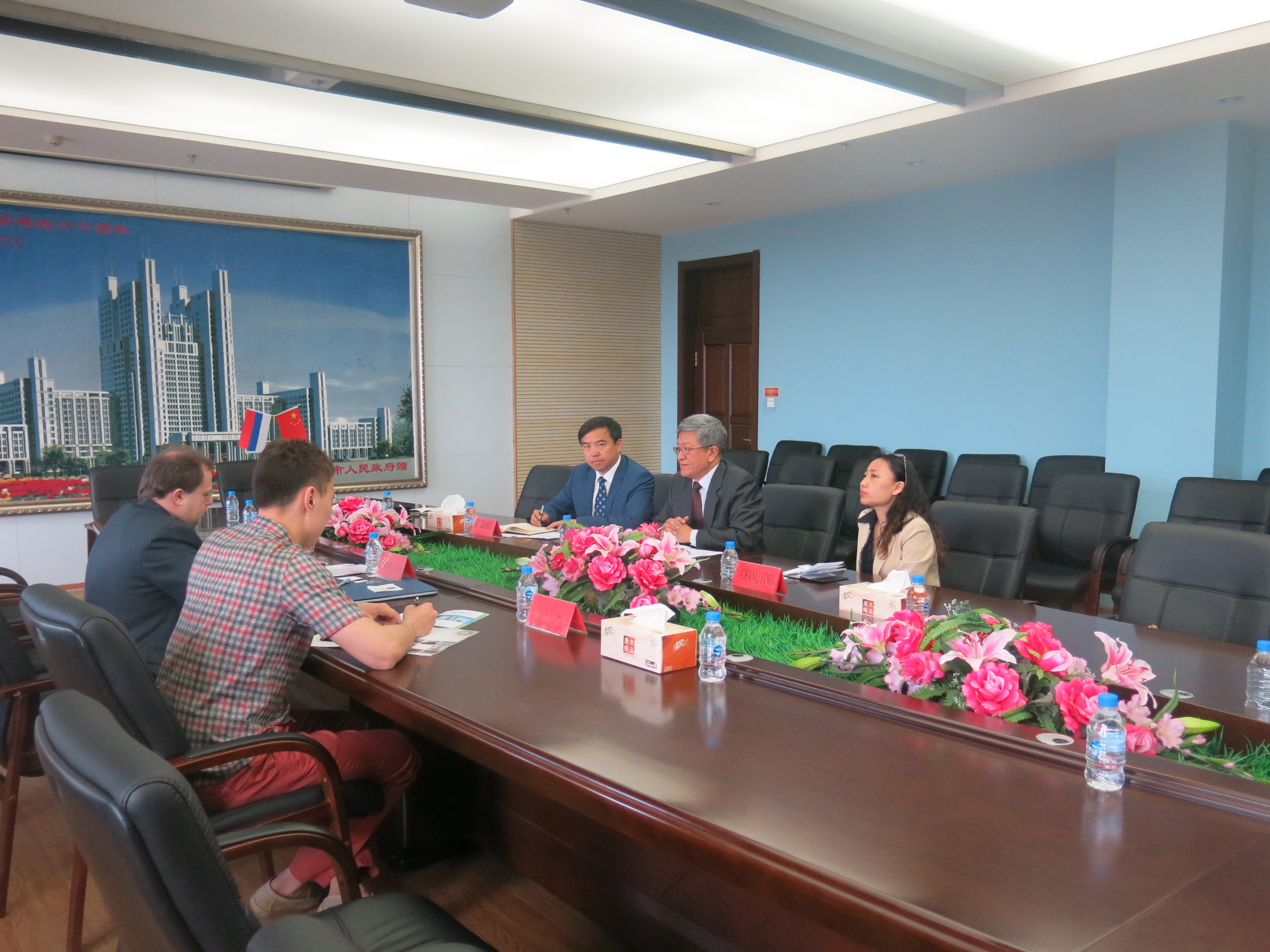 Those who attended the meeting are Xi Zhaohui, who is the director from International Cooperation and Exchange department, and Chang Ying who is the dean of Russian Department in Foreign Languages School.