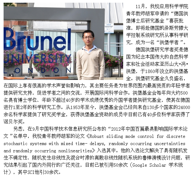 In September, ISTIC (Institute of Scientific and Technical Information of China) issued the list of “100 Most Influential Chinese Academic Papers in 2012”. His paper “Robust Sliding Mode Control for Discrete Stochastic Systems with Mixed time—Delays, Randomly Occurring Uncertainties and Randomly Occurring Nonlinearities” was incorporated into the list. The paper of Hu Jun has focused on the design of robust sliding mode control occurring uncertainties and randomly occurring nonlinearities. The research was attached great importance by national and international experts in this field. It has been cited 50 times by Google Scholar and 30 times by SCI.