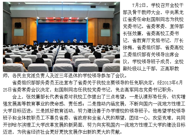 On July 2, a conference for all HUST cadres and backbone teachers was held. Zhao Baogang was appointed as HUST’s new Party secretary by the Provincial Party Committee. Zhang Xiaolian, minister of Communication Section as well as a member of the Standing Committe of Heilongjiang Province attended the conference. Some other leaders from Provincial Party Committee, including Xu Mei, director and Party secretary of provincial education as well as Party secretary of the college work council of provincial CPC committee of Heilongjiang, etc, HUST’s whole leading staff (including those who retired in the last 3 years), all cadres above deputy director level, professors and democratic parties principals attended the conference.