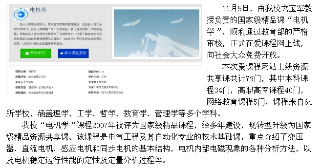 Electromechanics, as a national good qualified course of HUST authorized as early as 2007, was determined as the “candidate” for nationally-shared good qualified courses as well as HUST’s online course of Icourses.