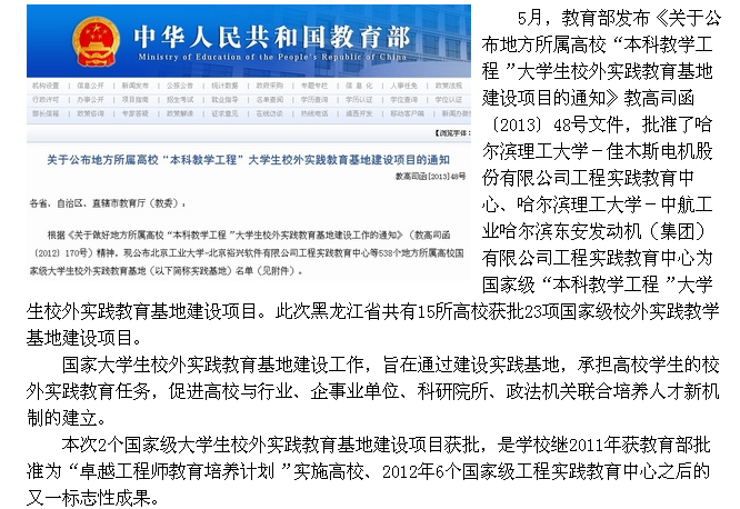 In May, according to the File No. 48, 2013 publicized by of Higher Education, MOE, China, two HUST engineering practice and education centers jointly built with Jiamusi Electric Machine Co., LTD and Avic Harbin Dongan Engine (Group) Co., LTD individually, were approved as state-leveled undergraduates’ off-campus internship bases supported by “National Undergraduate Cultivating Program”.