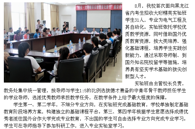 In August, HUST enrolled 31 students in Heilongjiang Province for “the President Daheng Experimental Elite Class” majoring in Electronic Engineering and Automation. The class took advantage of the excellent teaching resource under the principle of emphasizing the foundation and cultivating innovative capability through adopting supervisor system and foreign study to foster talents with solid foundation and prominent innovative capability.