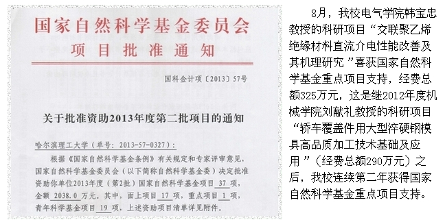 In August, professor Han Baozhong of the school of Electrical and Electronic Engineering won the sponsor of RMB¥3,250,000 by the National Natural Science Fund. Professor Liu Xianli won the sponsor of 2,900,000 in 2012. Until now, HUST has won the support from the National Natural Science Fund for two consecutive years.