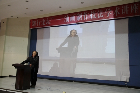 In order to increase the establishment of soft power of our university’s culture, enhance the artistic accomplishments of all faculties and students, and strengthen the exchanges and cooperation with foreign art, the Propaganda United Front Department and Art School jointly organized the “Zhixing Forum” series of academic exchanges activities, inviting Amur State Artistic Association Vice Chairman, Professor of Art Department of Amur National University,Гласников Владимир Григорьевич and his party to visit our university on the 10, December, and gave a lecture of painting techniques for the staff and students in the hall of library. Assistant Dean of Art School, Fan Chuanjun, presided over the lecture, the Deputy Director of the School Party Committee Propaganda of United Front Department, Wu Qiufeng, and the leadership of the Art School also attended the lecture.