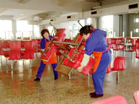 The staff of the catering center of the Logistics Group are cleaning the canteen.