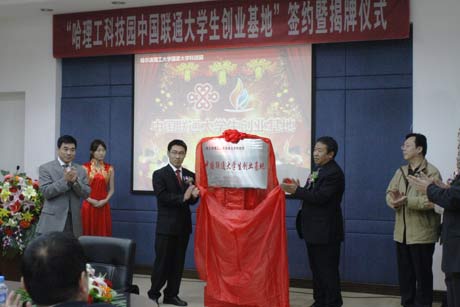 At the meeting, General Manager of Science Park Yu Pengtian and General Manager of Marketing Center of the Key Account Bie Huaijiang signed the strategic cooperation agreement and Vice President of HUST Wei Xinlao and Vice Manager of Heilongjiang Branch of China Unicom Qin Wei jointly unveiled the plaque for the college student entrepreneurial base.